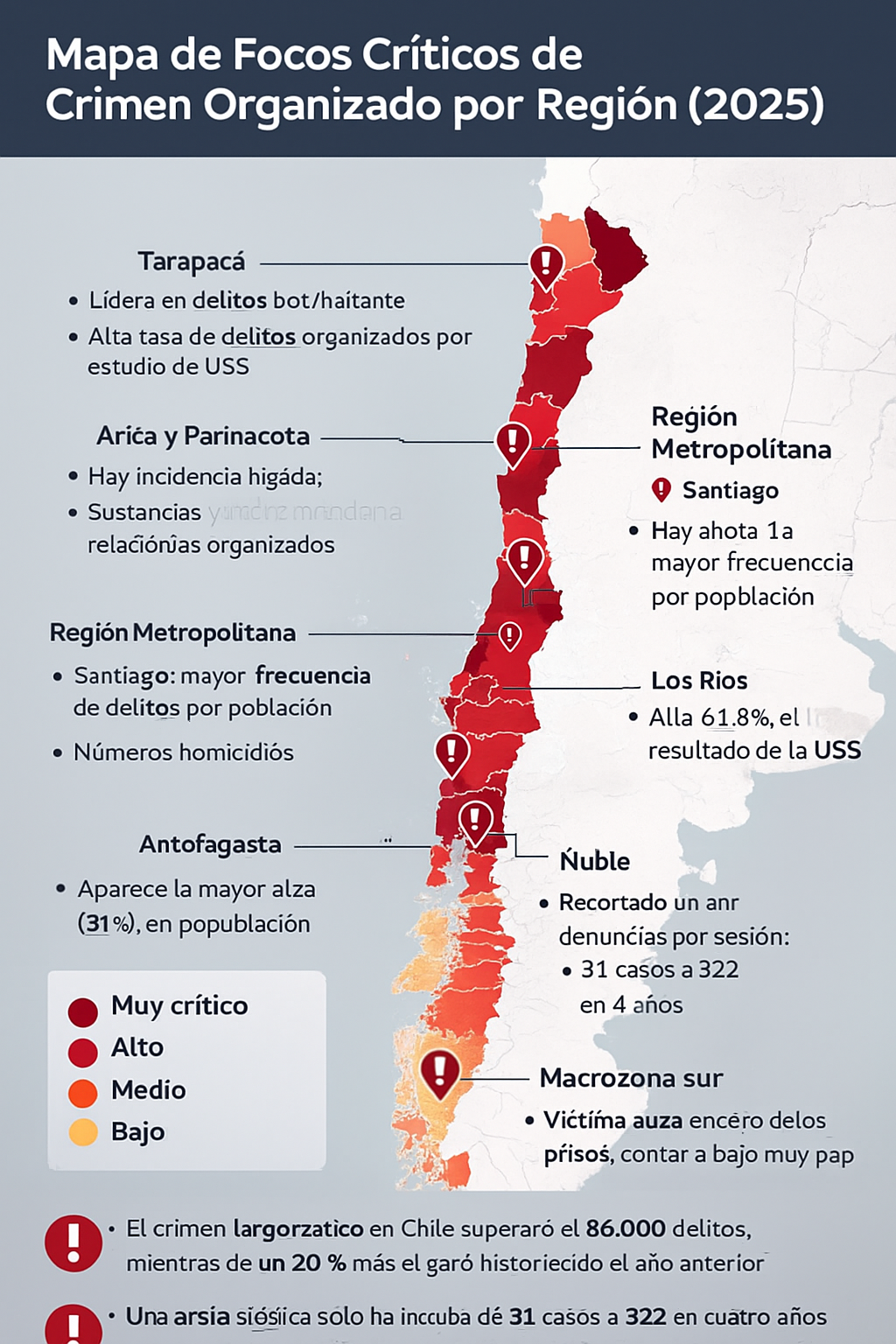 En 2024, el crimen organizado en Chile superó los 86.000 delitos, lo que representa un aumento de más del 20 % respecto al año anterior.